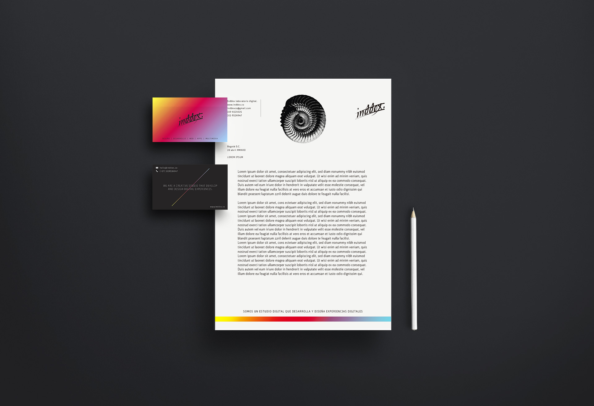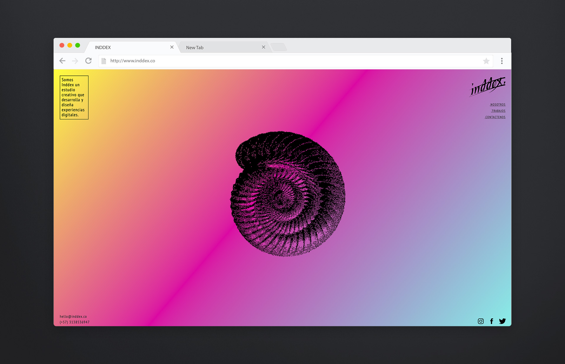 Inddex is a friends` digital and creative studio, I based this project on fractals and mathematical harmony with modern colors, I created an element based on the nautilus that represented the communion between the digital, the mathematical and the creative experience.